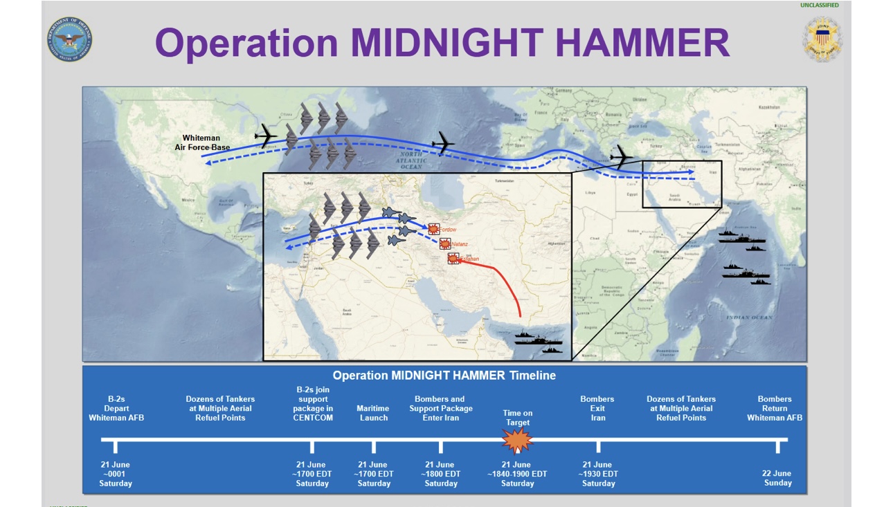 미국 화이트먼 공군기지에서 B-2 스피릿 스텔스 폭격기 7대가 이륙했습니다. 이들은 대서양을 가로질러 중동을 향해 비행했으며, 일부는 태평양 괌 방면으로 향하는 것으로 위장해 적의 혼란을 유도했습니다. 공중 급유를 통해 장거리 비행을 가능하게 했습니다.