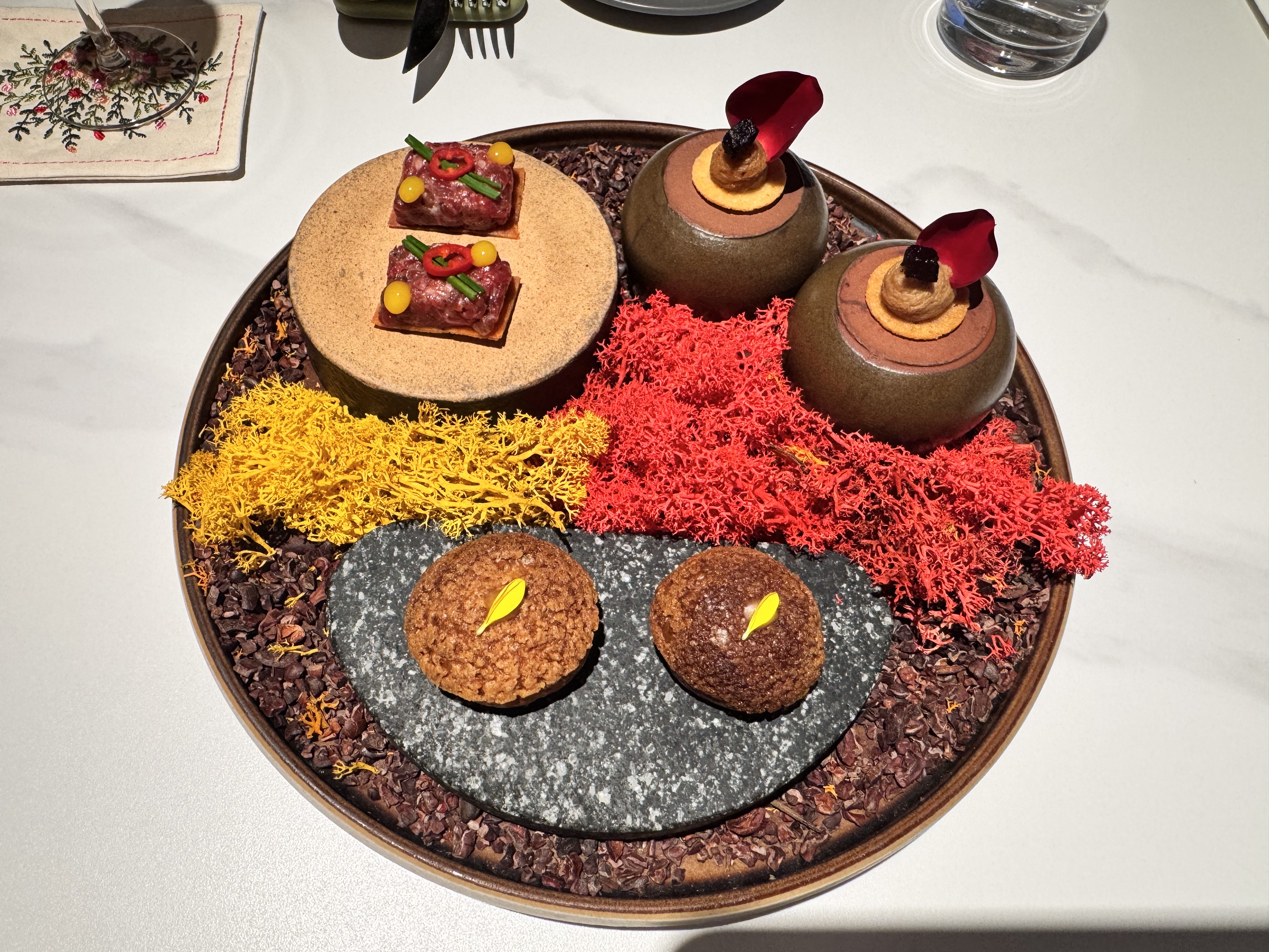 - 타르타르: 구운 파마산치즈칩 위에 트러플 소스가 어우러진 육회와 노른자 겔, 차이브, 홍고추로 장식하였는데 손으로 한입에 먹었는데 씹을 수록 입안에서 풍미가 퍼졌는데, 짝궁과 나는 트러플을 좋아해서 시작이 너무 좋았습니다.