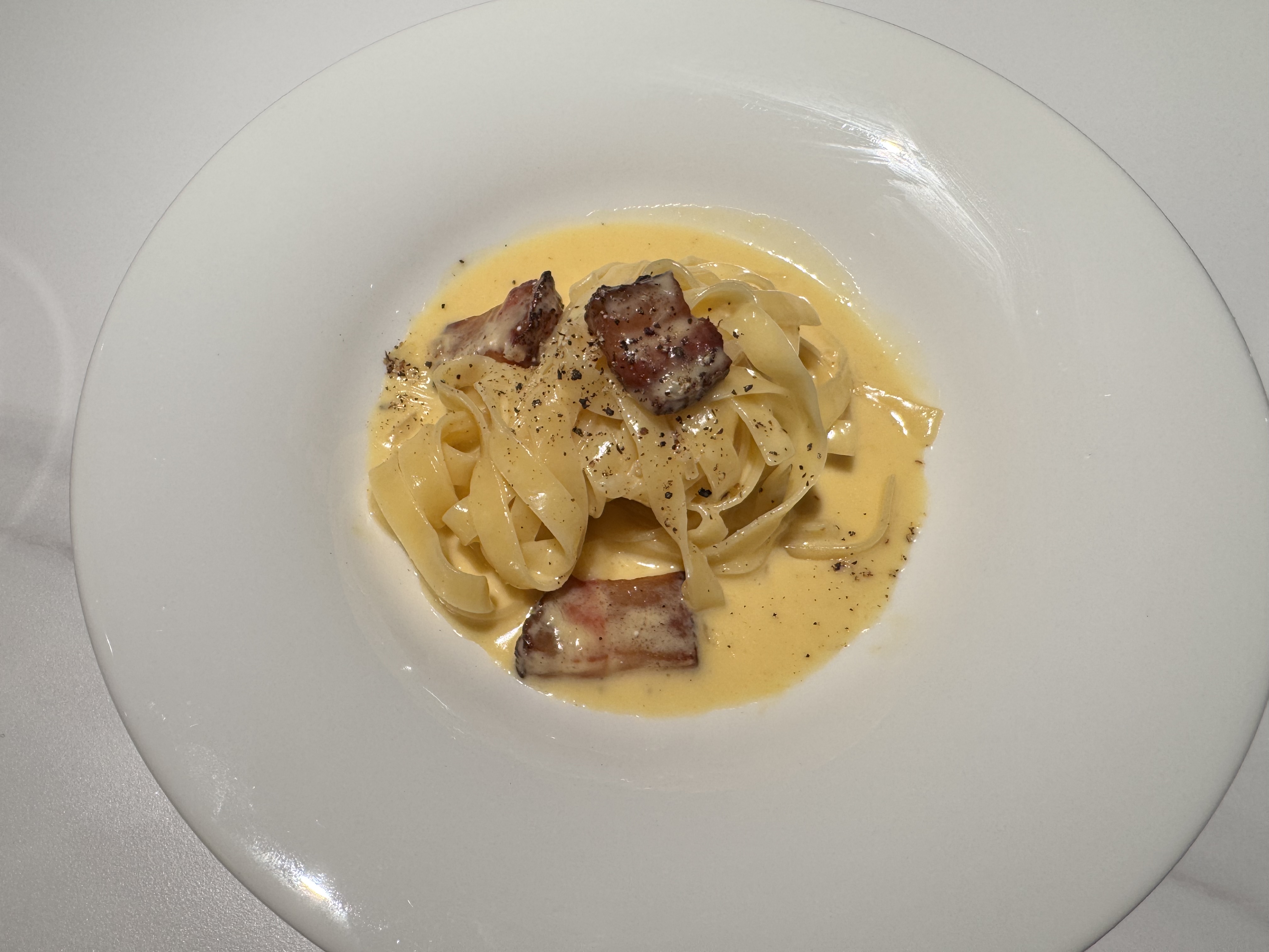 계란 노른자와 그라파다노 치즈가 들어간 꾸덕한 소스에, 이탈리아 전통의 햄이 들어가 있는데 집에서 해보았던 까르보나라와는 차원이 달리 엄청 고소했습니다.