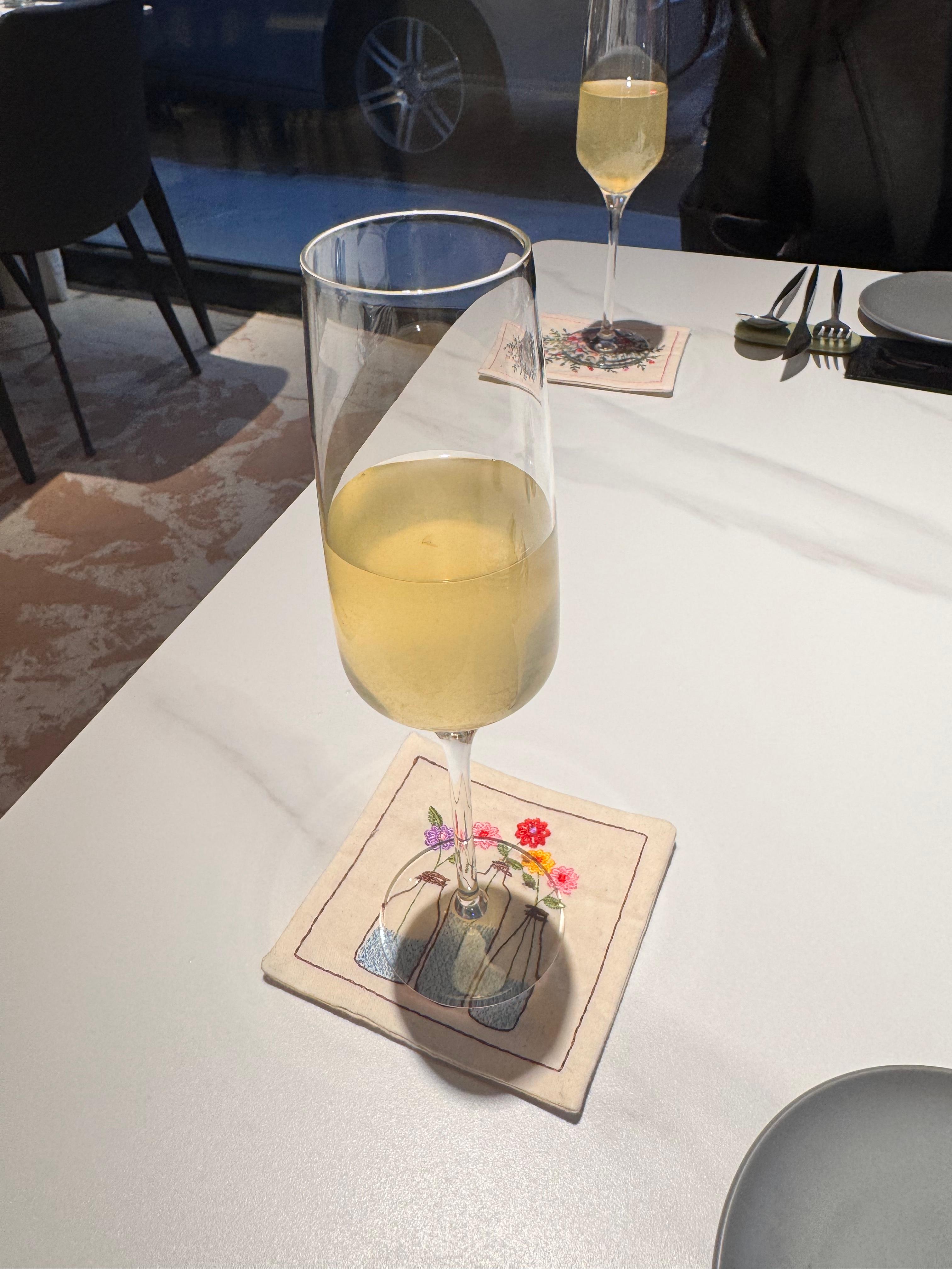 1,2 코스 전 첫 페어링으로는 사과와 유자로 만든 과실주가 나왔는데, 한모금 했는데 사과와 유자의 조화로운 달달함에 계속 마시고 싶었습니다.