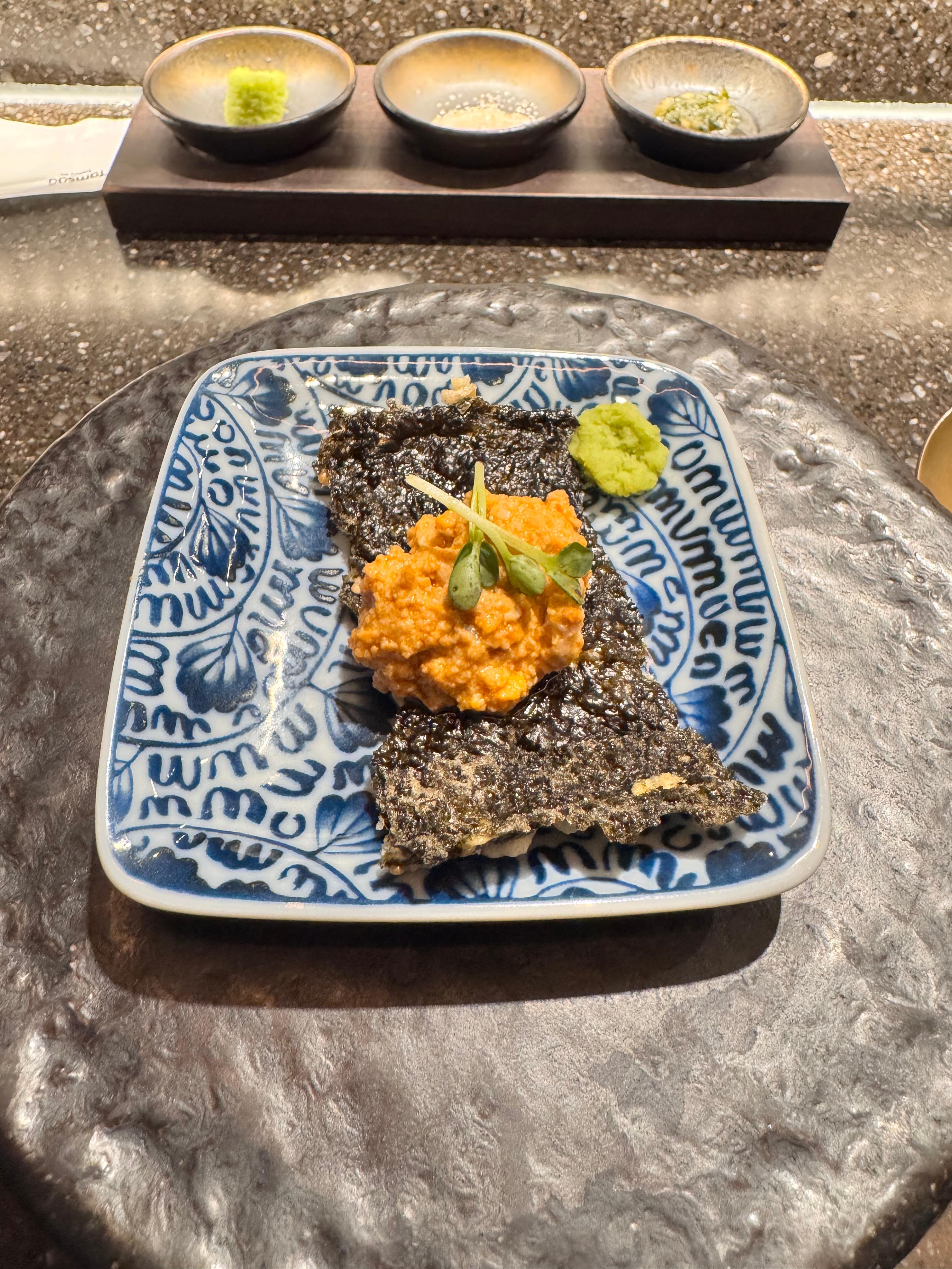 - 핑거푸드: 김부각 위에 아키모 (아귀간)