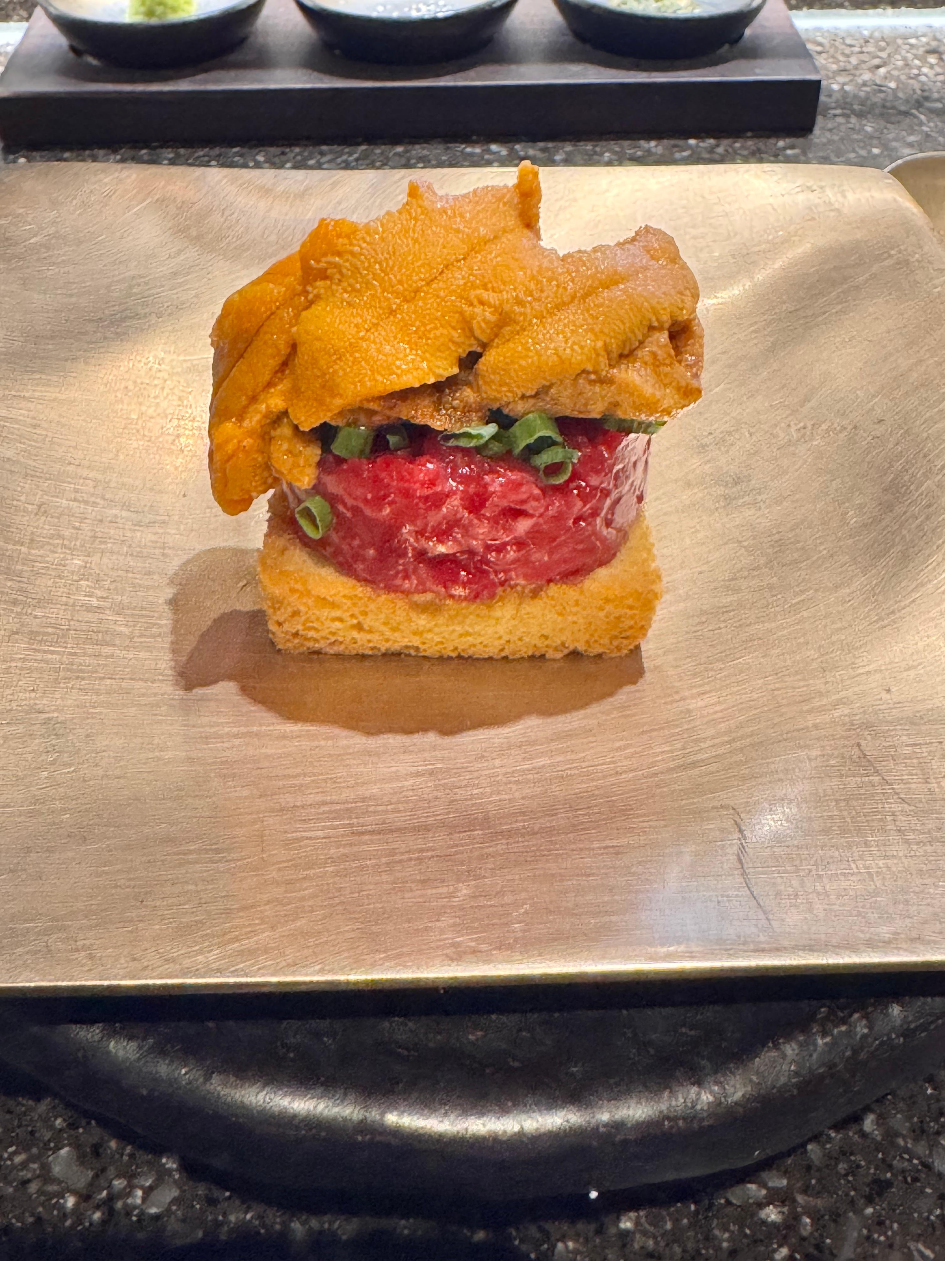육회+빵+쪽파 위에 추가한 우니를 얹어서!