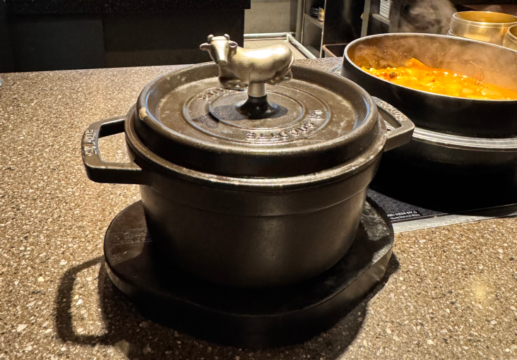 육회가 나올 때 부터 올려져 있던 솥단지 속에는 꽃게 된장찌개가!