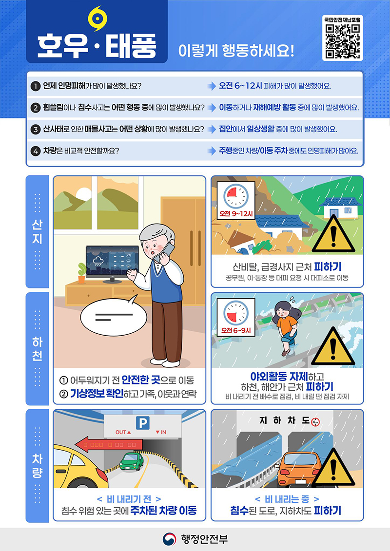 - ✔️ 호우·태풍으로 인한 인명피해는 오전 6시~12시에 가장 많이 발생합니다.