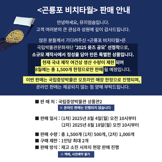 그러던 중 7월 말, 온라인 뮤즈샵에 눈에 띄는 공지가 올라왔습니다. 바로 8월 4일과 18일에 곤룡포 비치타올을 현장 판매한다는 것! 1인당 최대 2개까지 구매 가능하고, 선착순 250명만 입장할 수 있다는 조건이 붙었습니다.